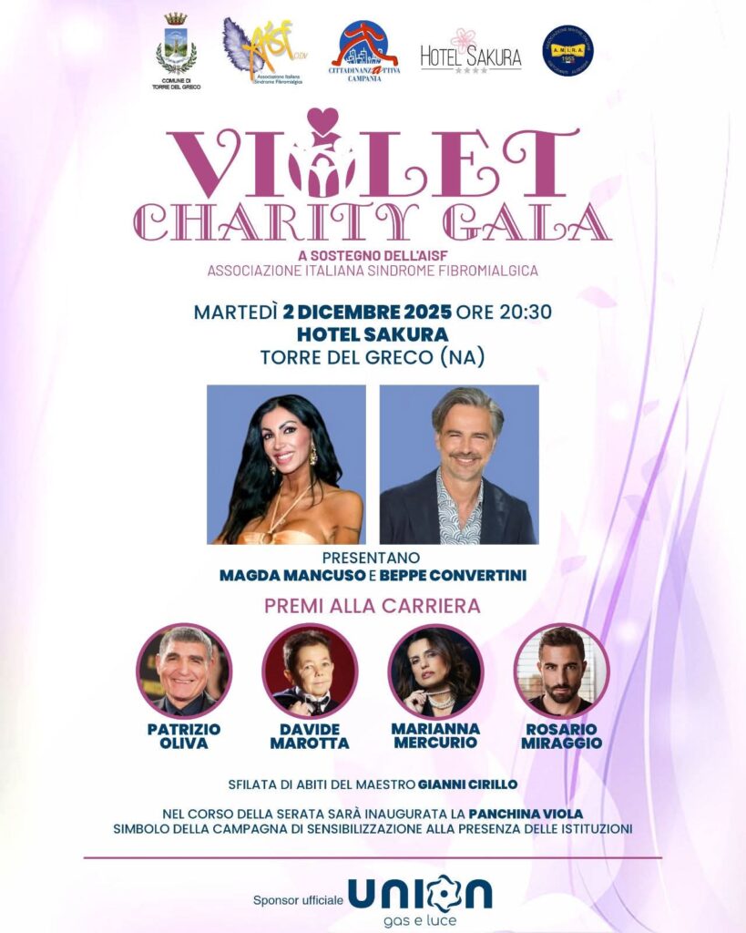 A Napoli presso “Hotel Sakura” di Torre del Greco (NA) ci sarà stasera 2 dicembre 2025 l’esclusivo evento di beneficenza “Violet Charity Gala”. La serata, ideata dalla giornalista e conduttrice televisiva Magda Mancuso, nasce dalla collaborazione tra Cittadinanzattiva Campania e AISF odv (Associazione Italiana Sindrome Fibromialgica).